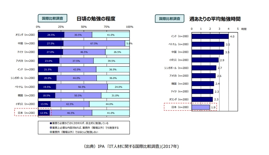 また、「業務で必要かどうか関わらず、自主的に勉強している」と答えた割合は12.5%であり、他国と比べて低い値になっています。また1週間あたりの平均勉強時間については、日本は1.9時間とインド(4.0時間)、ベトナム(3.5時間)、中国(3.5時間)などのITオフショア大国の半分ほどになっています。2NFはこの結果の背景には各国の仕事文化などの影響もあると考えますが、日本のIT人材がスキルアップにあてがう時間は海外のIT人材と比べて少ないという現状があるということです。