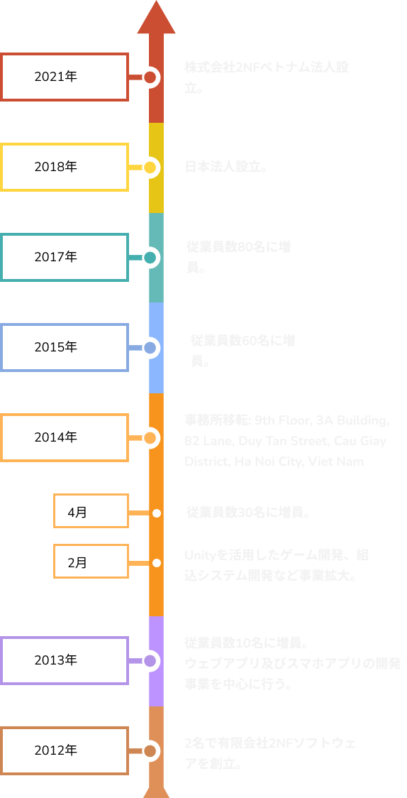 世界で認められるベトナムの情報技術企業を作る願望を持っていた創設者たちが、日本で働いた期間の後に帰国し、2NFソフトウェアを確立することにしました。準備の長期間の後、有限会社2NFソフトウェアが2012年4月17日に正式に確立されました。その確立日から10年以上を経て、2NFソフトウェアが国際的な作業手順を立つことができ、高品質と合理的な費用が両方保証されるように努力しております。そのため、2NFソフトウェアが日本、韓国、ドイツ、オーストラリアなどの要求の厳しさが高い市場での顧客を満足させ、高い評価を受けています。また、様々な分野の案件を通じて、若くて能力レベルが高い人材を育成し、彼らにキャリア開発の機会を与えています。