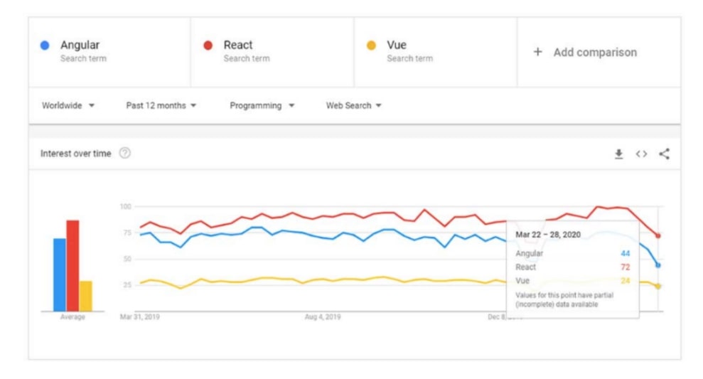 #1 Googleトレンドの過去12か月の検索トレンド((以下のグラフ)を見ると、Reactが最も人気な検索キーワードであることがわかります。Vue.JSはAngularとReactを大きく下回っています。しかし、若いフレームワークとしては、 Vueの数字は決して悪くはないでしょう。