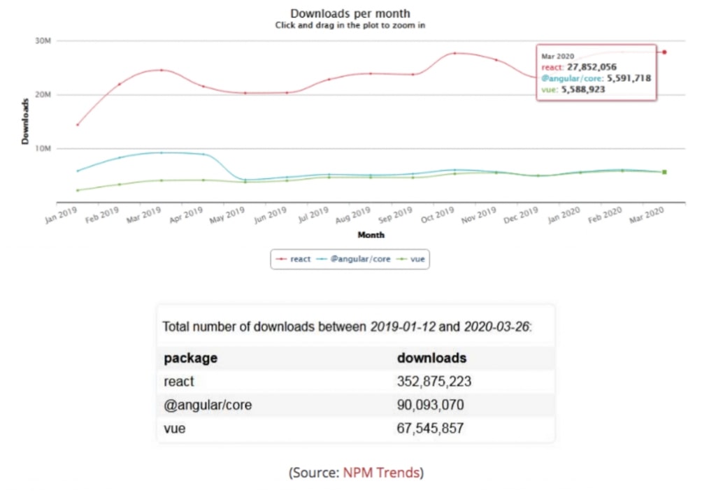 #3 NPMの調査結果では、圧倒的にダウンロード数が多いのはReactです。次いで、 Angularが2位になりました。