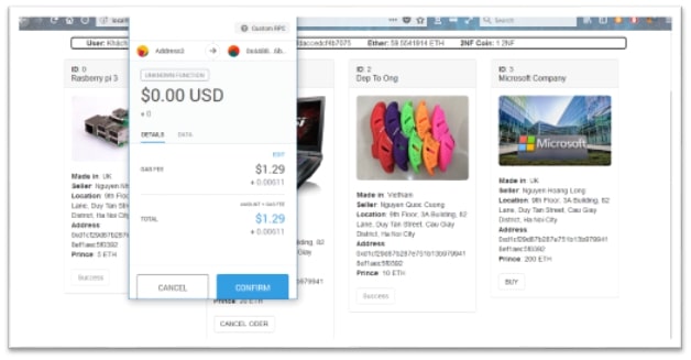 - 買い手がオンラインで注文した際、代金(デモ版での通貨はEther)はSmartContractのアドレスに送られ、そこに保存されます。