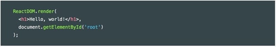 JSXは、HTMLタグをJavaScriptコードの中にじかに書く構文です。つまり、テンプレートがJavaScriptコードで定められることになります。つぎのコードは、ひな形から引用しました。はじめは違和感があるかもしれません。これは、マークアップとViewのロジックは密であるべきという開発者の考えにもとづいているとのことです。