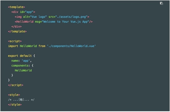 学習コストは高くありません。小さく始めて、少しずつ進めることで、段階的に学べます。ただ、公式サイトは始めやすさを重視しているらしく、簡易な構文のサンプルもあり、本格的な開発のスタイルは改めて考える必要がありそうです。つぎのコードは、単一コンポーネントファイル(VUE)のひな形からの引用です。テンプレートとJavaScriptコードそれにスタイルシートが、ひとつのコンポーネントのファイルとしてまとめられています。